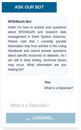 NFDI4Earth's new chatbot enables natural language access to Earth science-specific knowledge. Based on established Retrieval-Augmented Generation (RAG) concepts, it extends the NFDI4Earth OneStop4All with an interactive query interface. The technical implementation combines modern language models provided by ScaDS.AI with a vector database for semantic document storage. This approach allows efficient indexing of GitLab-hosted markdown documents and provides context-aware responses through semantic search capabilities.